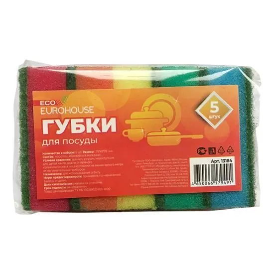 13184 Губки для посуды 5 шт. 75*45*25 мм EcoHouse, шт., 1/60 (13184 из п/э пакета 1/60)
