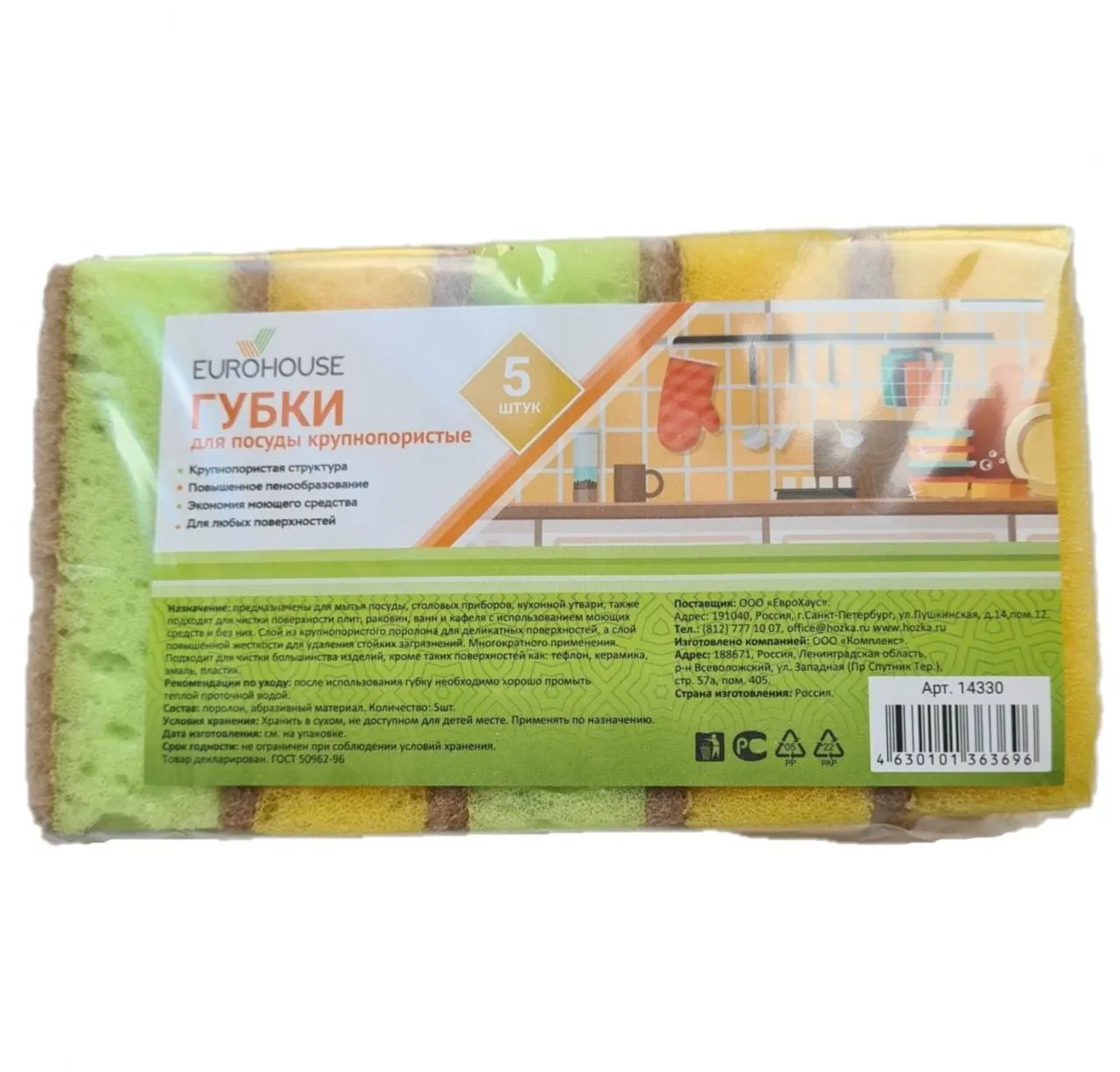 14330 Губки для посуды Крупнопористые, 5шт, EuroHouse (14330 из п/э пакета 1/36)