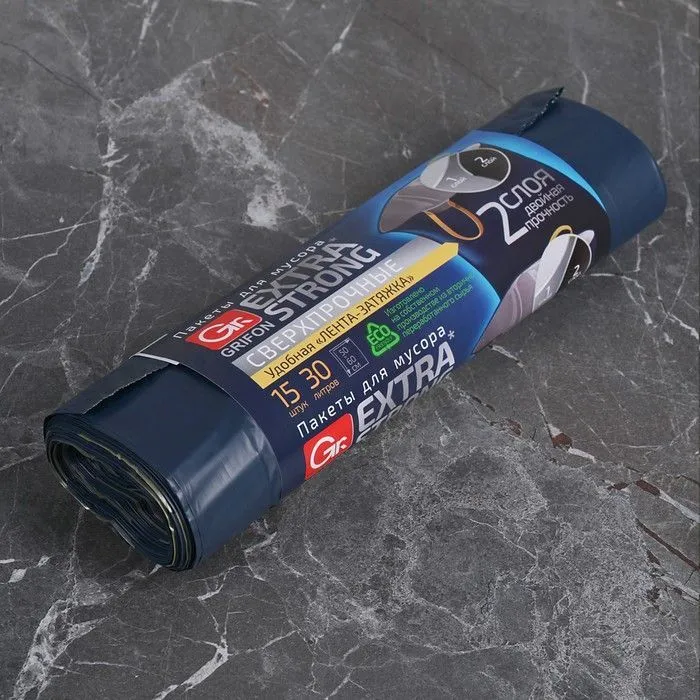 Мешки для мусора 30л двухслойные с завязками, ПВД, толщина 30мкм, 50х60 см, 15 шт. в рулоне 38629