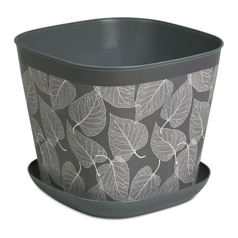 Кашпо квадратное 5,0л. декор Листопад с поддоном (темно-серый)