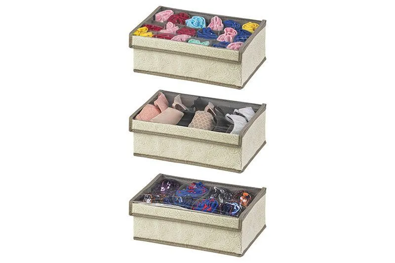 Набор 3 коробов для нижнего белья и носков "Розы на бежевом", 34*23*12 см - каждый (6,8,18 отделений) с прозрачной крышкой на липучке, состав - высоко
