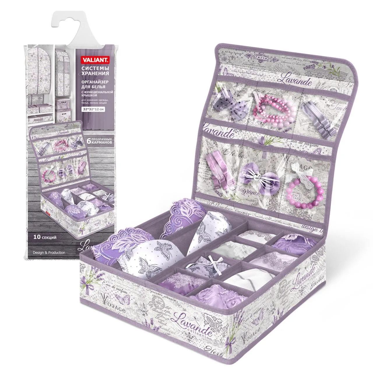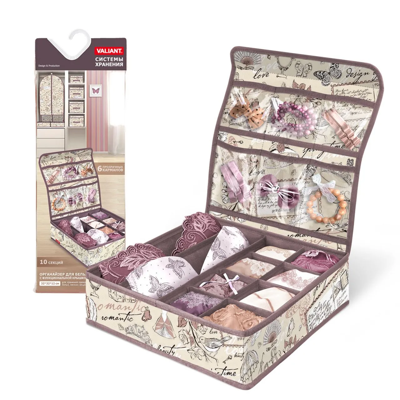 Кофр для нижнего белья и носков "Розы на бежевом", 32*32*12 см, 24 секции, с прозрачной крышкой на липучке, состав - высококачественный нетканый мате