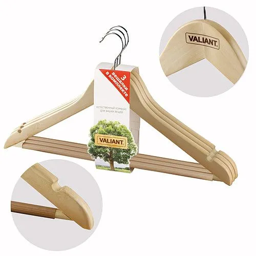 VAL 13014S Набор вешалок дер,3шт.с противоск. вст-ми на плеч-х, с выемками, перекл.,44.5x23x1.2см, натур.цвет