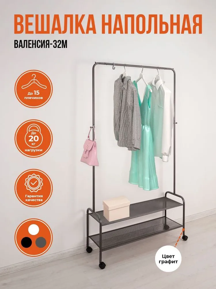 #Вешалка гардеробная "Валенсия 32М" с двумя полками, на колёсах (VALENCIA 32M clothes rack) (Графит)