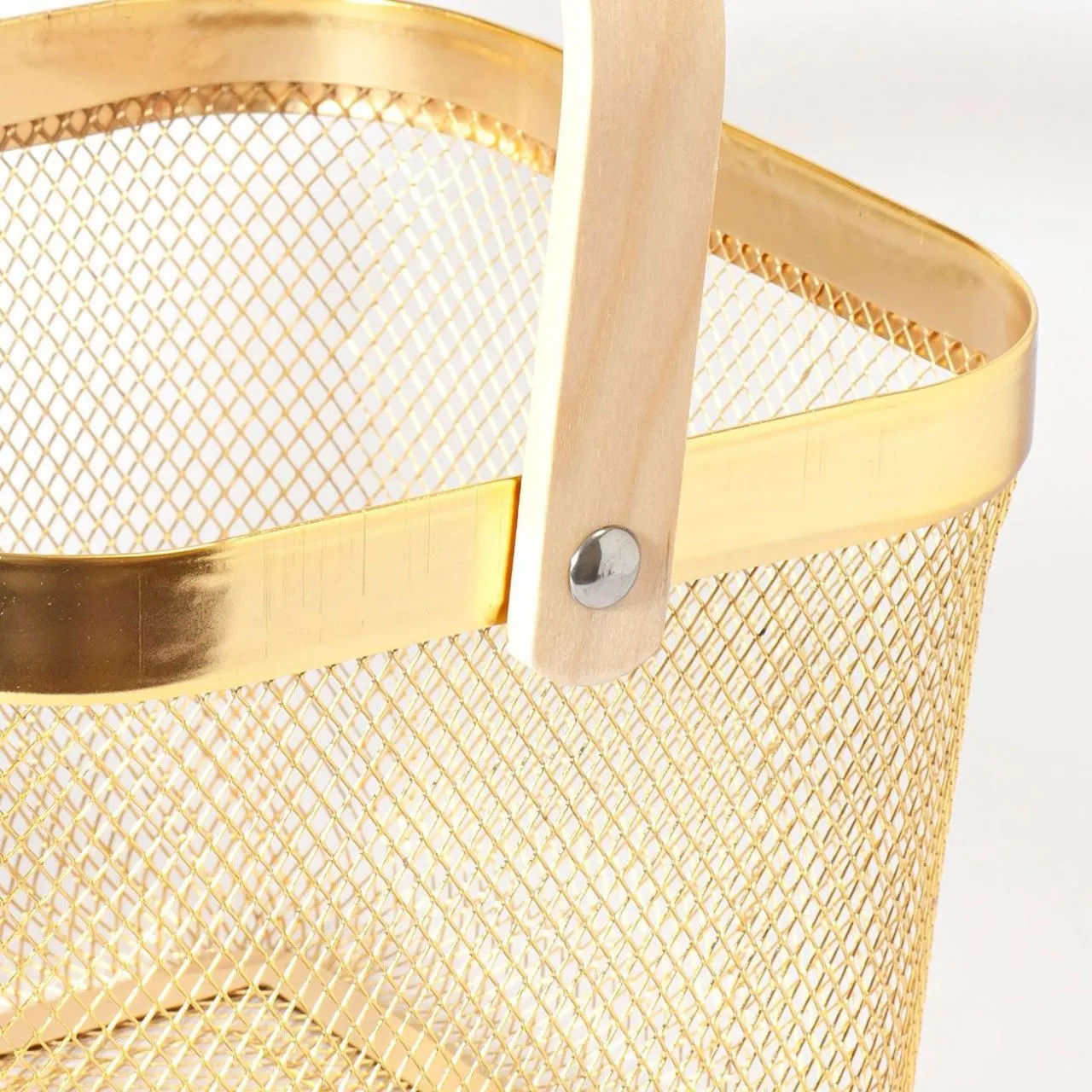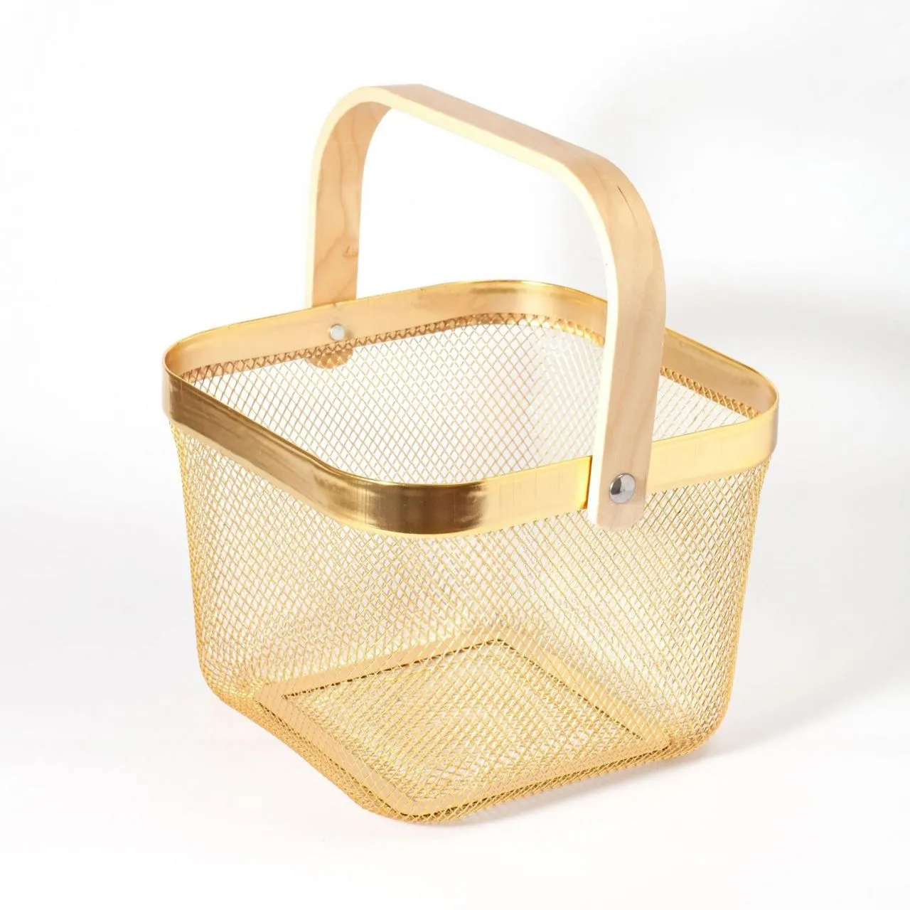 Корзина метал, квадратная с деревянной ручкой, цвет золото 16365-2