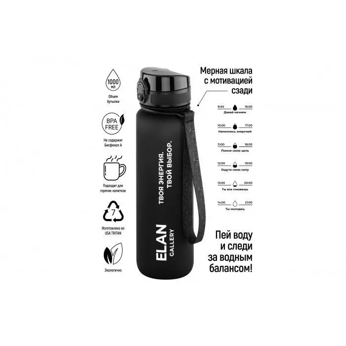 Бутылка для воды "Style Matte" черная, мотивационная, 7,8*7,8*28,5 см 1000 мл, высота до крышки 24 см, с ситом, с защитным клапаном от протечек, кнопк