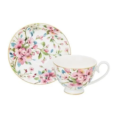 Чайная пара "Яблоневый цвет на белом" 2 предмета, чашка - 12,5*9,5*7 см, 300 мл, блюдце - 15*15*2 см, на ножке, в п/у, NEW BONE CHINA