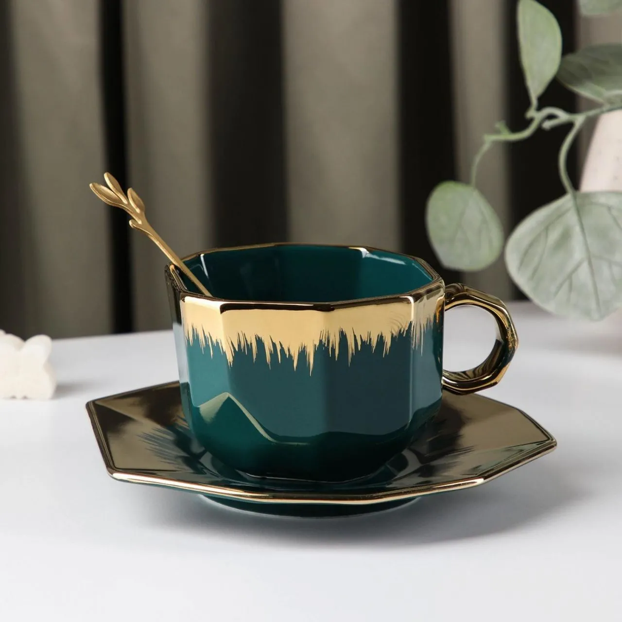 Чайная пара с ложкой "Закат" чашка 260 мл, блюдце 15 см, цвет изумруд 7329165