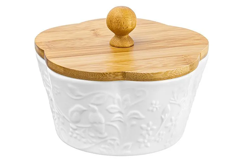 Банка для печенья круглая рельефная "Птички на ветке" 14,8*14,8*11,5 см, 760 мл, с деревянной крышкой, высота без крышки - 7 см