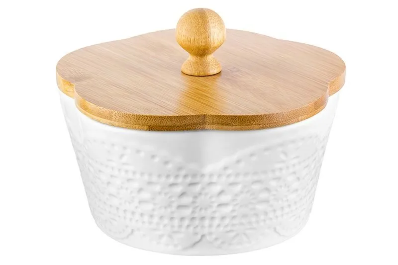 Банка для печенья круглая рельефная "Кружево" 14,8*14,8*11,5 см, 760 мл, с деревянной крышкой, высота без крышки - 7 см