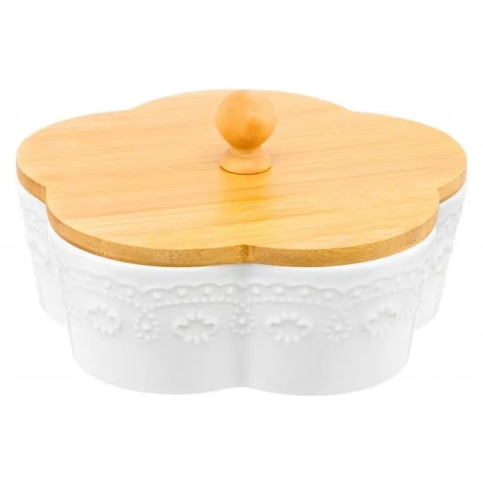Банка фарфоровая для печенья круглая рельефная "Цветок Белый узор" 19,5*19,5*10 см, 900 мл, высота без крышки 6 см, с деревянной крышкой