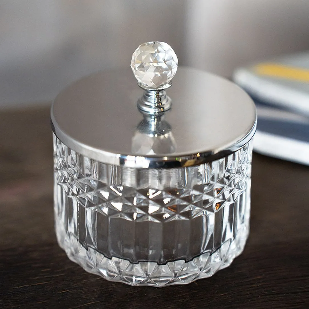 #Стеклянная шкатулка с серебряной крышкой, Д90 Ш90 В95, прозрачный