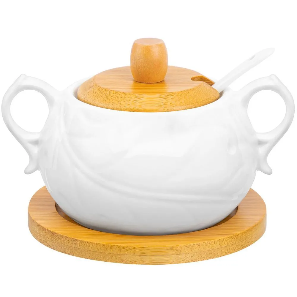 Сахарница "Айсберг" 14,5*11*9 см, 400 мл, с ручками и деревянной крышкой, на деревянной подставке, диметр подставки - 12,3 см, высота без крышки - 6 с