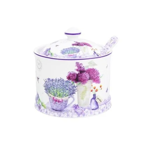 Сахарница "Лаванда" 9*9*10 см 320 мл, с ложкой, высота без крышки - 6,5 см, NEW BONE CHINA