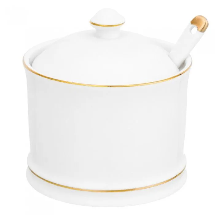 Сахарница "Белая с золотом" 9*9*10 см 320 мл, с ложкой, высота без крышки - 6,5 см, NEW BONE CHINA