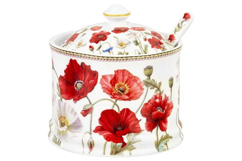 Сахарница "Маки" 9*9*10 см 320 мл, с ложкой, высота без крышки - 6,5 см, NEW BONE CHINA