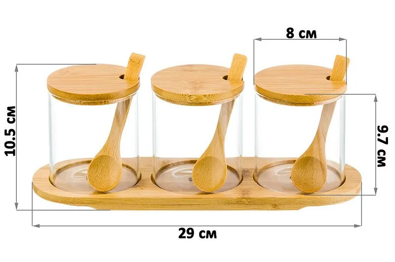 Набор банок для специй "Crystal glass" 3 предмета 29*9,5*10,5 см, 8*8*9,7 см 380 мл - каждая, высота без крышки - 9 см, на бамбуковой подставке, с бам