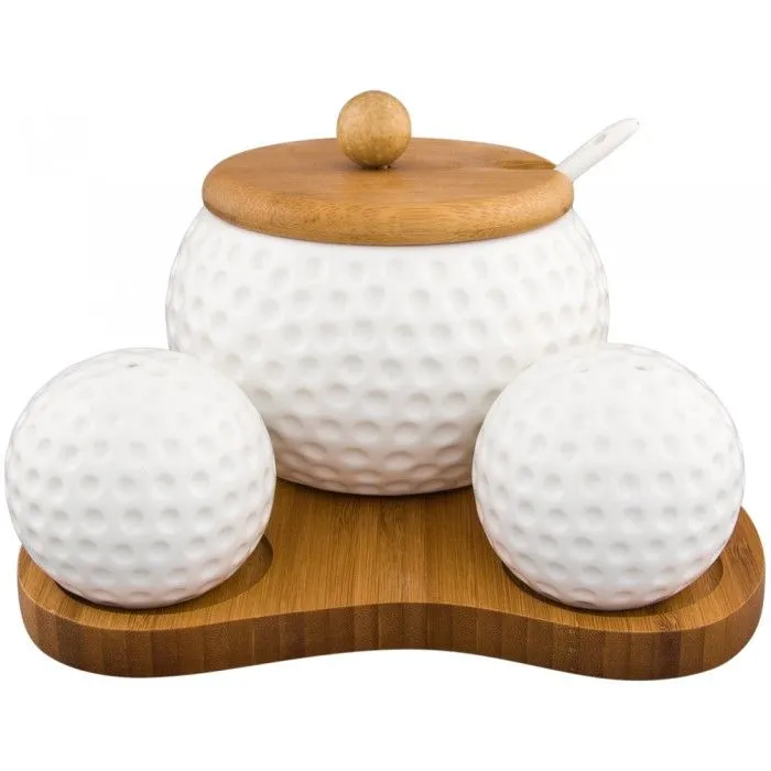 Набор "Сфера" 16*17*8,5 см - сахарница 440 мл с ложкой и деревянной крышкой, солонка и перечница, на деревянной подставке