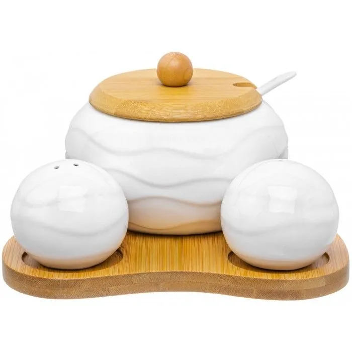#Набор "Айсберг волны" 16*17*8,5 см - сахарница 440 мл с ложкой и деревянной крышкой, солонка и перечница, на деревянной подставке