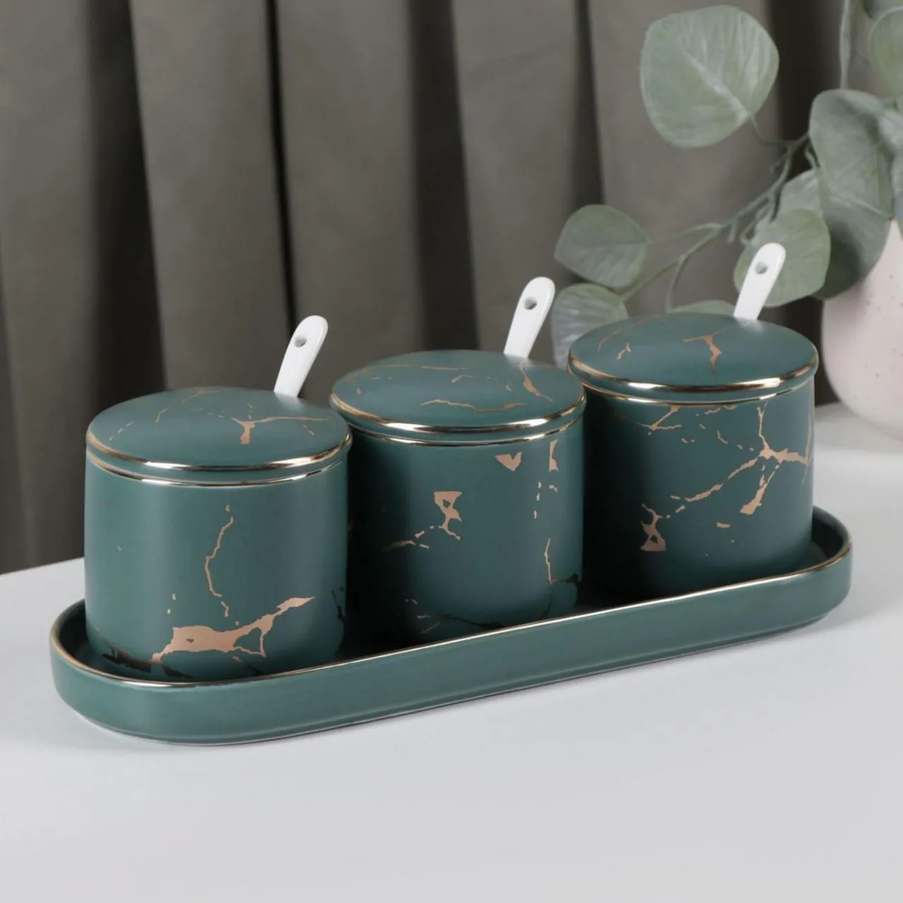 Набор банок на керам подставке 3 шт "Gold" 250 мл, 3 банки 8х8 см, 3 ложки, цвет зеленый 6941050