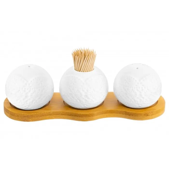 Вазочка под зубочистки + набор для специй "Кружево" 3 предмета, 19,5*7*6 см - в наборе, 6*6*5 см, 75 мл - каждая, на деревянной подставке