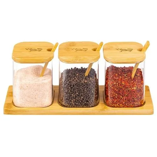 Набор 3 банок для специй "Crystal glass" 29*9,5*11,5 см, 8*8*11 см 450 мл - каждая, высота без крышки - 10 см, на бамбуковой подставке, с бамбуковыми