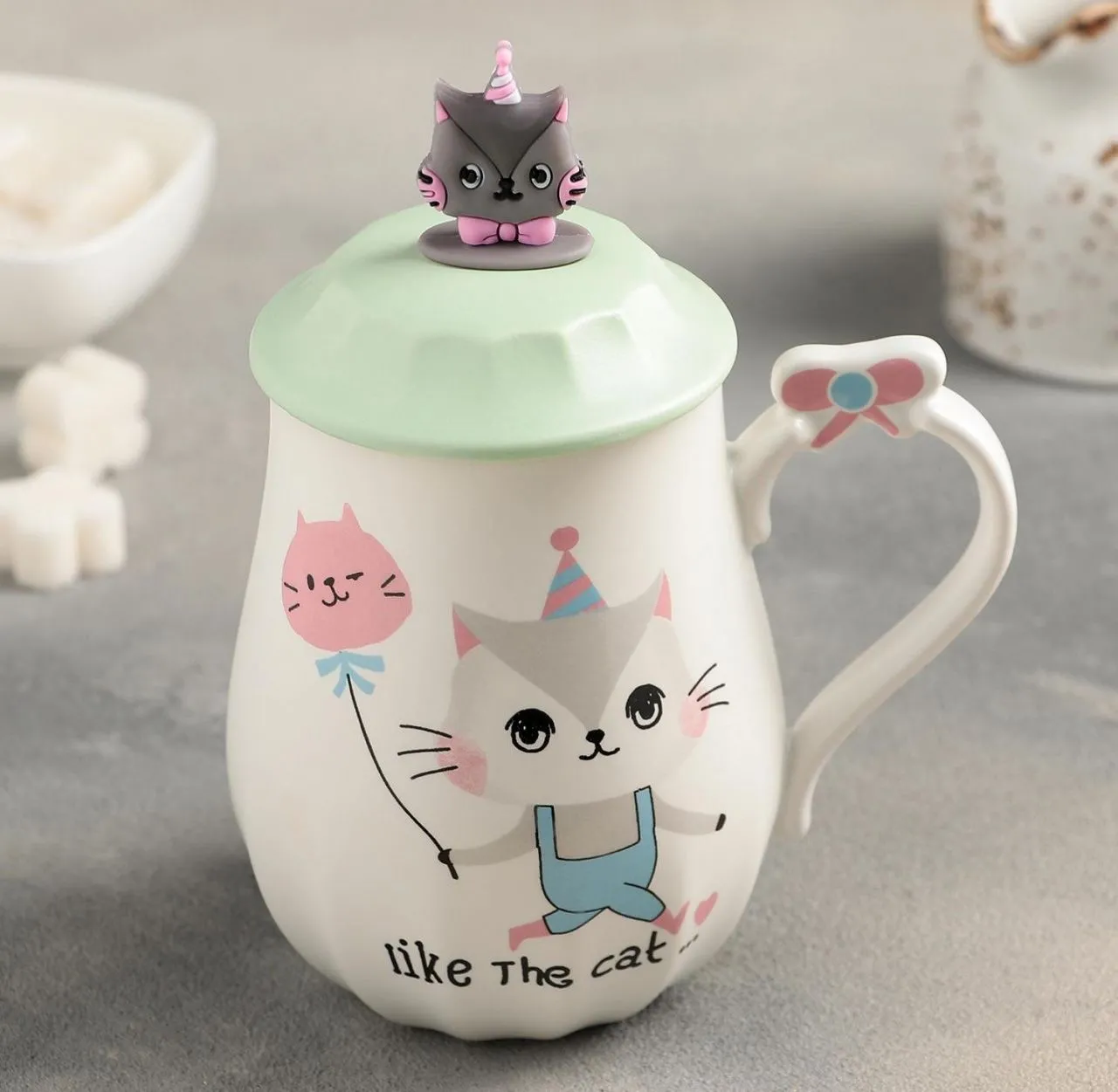 Кружка с керамической крышкой и ложкой "Животные" 450 мл 8,5х8,5х14 см, рисунок МИКС 3095889