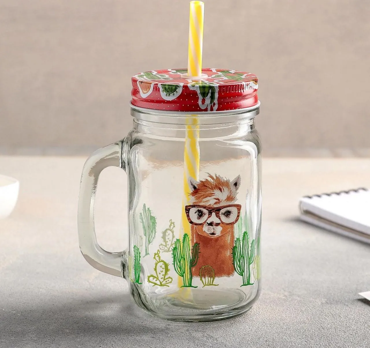 Банка с ручкой, крышкой и трубочкой "Лама" 450 мл, 10х7,5х13 см 4438502