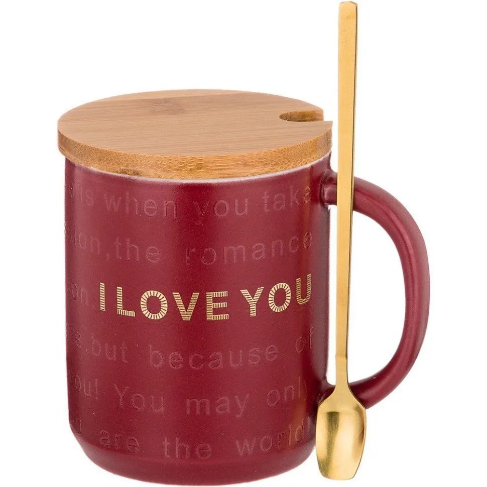 КРУЖКА "BREAK TIME" С ЛОЖКОЙ И ДЕРЕВЯННОЙ КРЫШКОЙ 350МЛ, ВИННО-КРАСНАЯ 90-1027