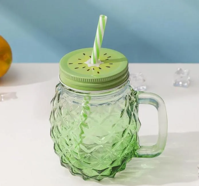 Банка 450 мл прозрачная с ручкой "Ананас градиент", крышкой и трубочкой, цвета МИКС