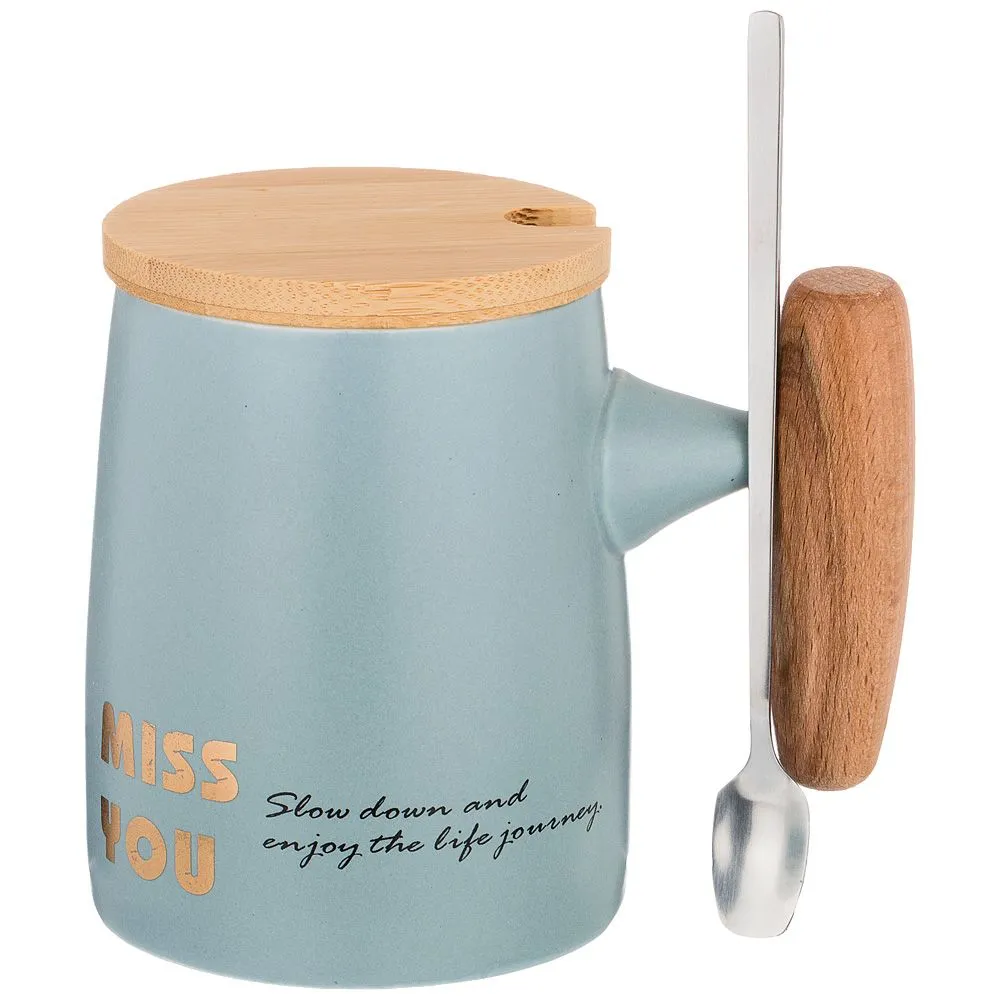 КРУЖКА "BREAK TIME" С ЛОЖКОЙ И ДЕРЕВЯННОЙ КРЫШКОЙ 390МЛ, ГОЛУБАЯ (КОР=60ШТ.)