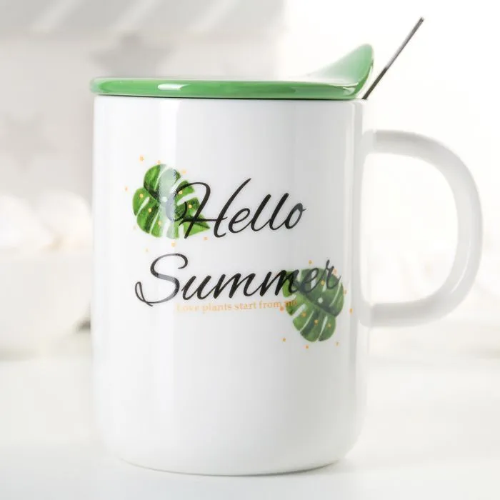 Кружка с керамической крышкой и ложкой "Монстера" 300 мл, 11х8х12 см, рисунок МИКС 3929425