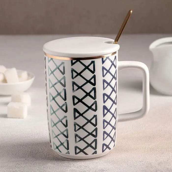 Кружка с керамической крышкой и ложкой "Геометрия" 350 мл, 11х8х12 см, рисунок МИКС 4491306