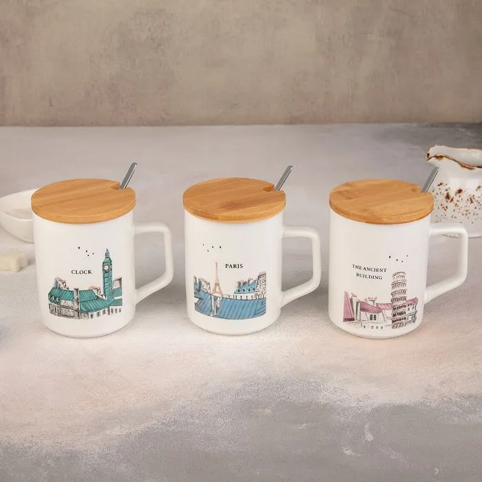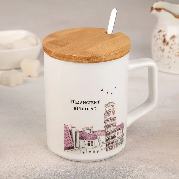Кружка с деревянной крышкой и ложкой "Достопримечательность" 350 мл, 11,5х8,5х11см, рис МИКС 4624641