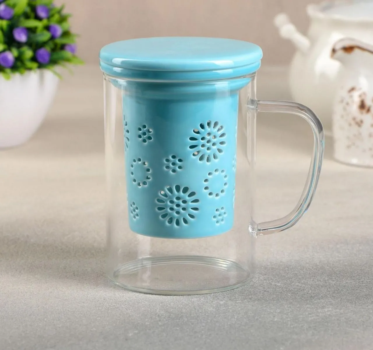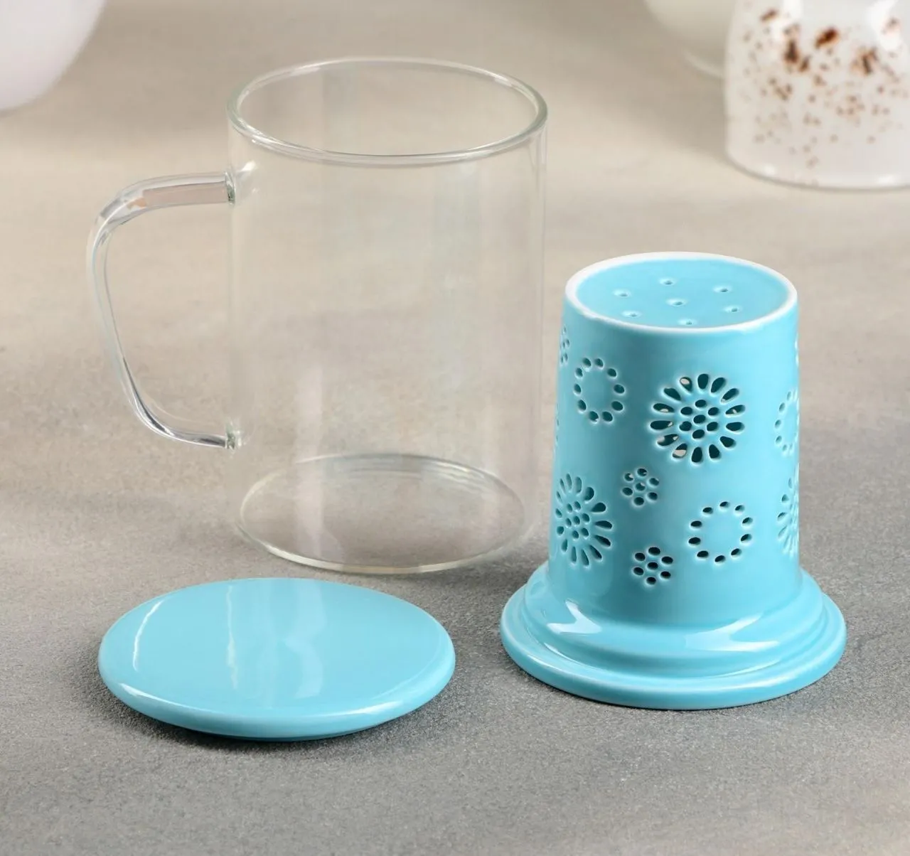 Кружка с керамическим ситом и крышкой "Нежность" 350 мл, цвет голубой 4708392