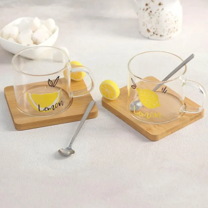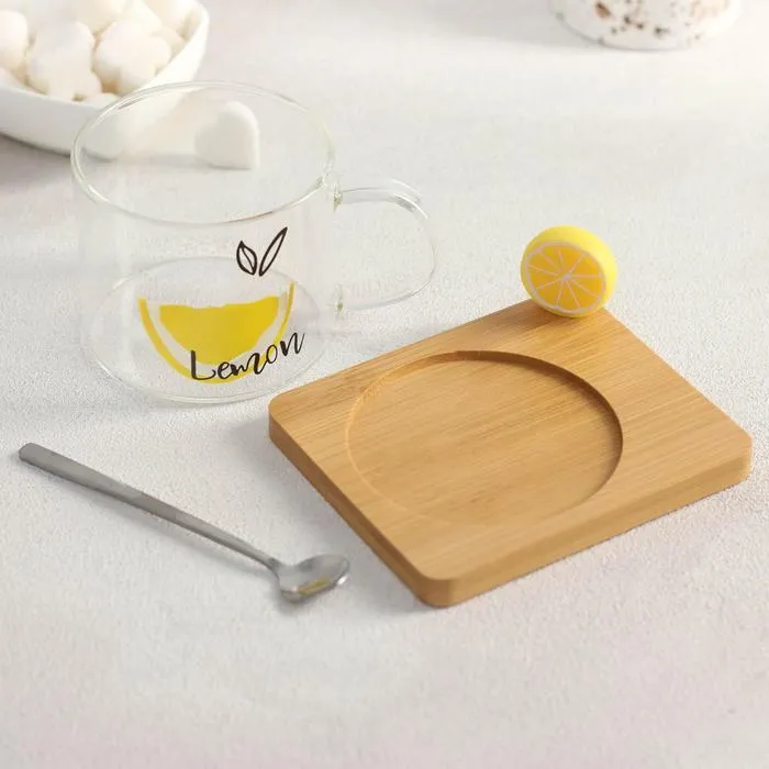 Кружка с деревянной подставкой и ложкой "Лимон" 300 мл, МИКС 5081225