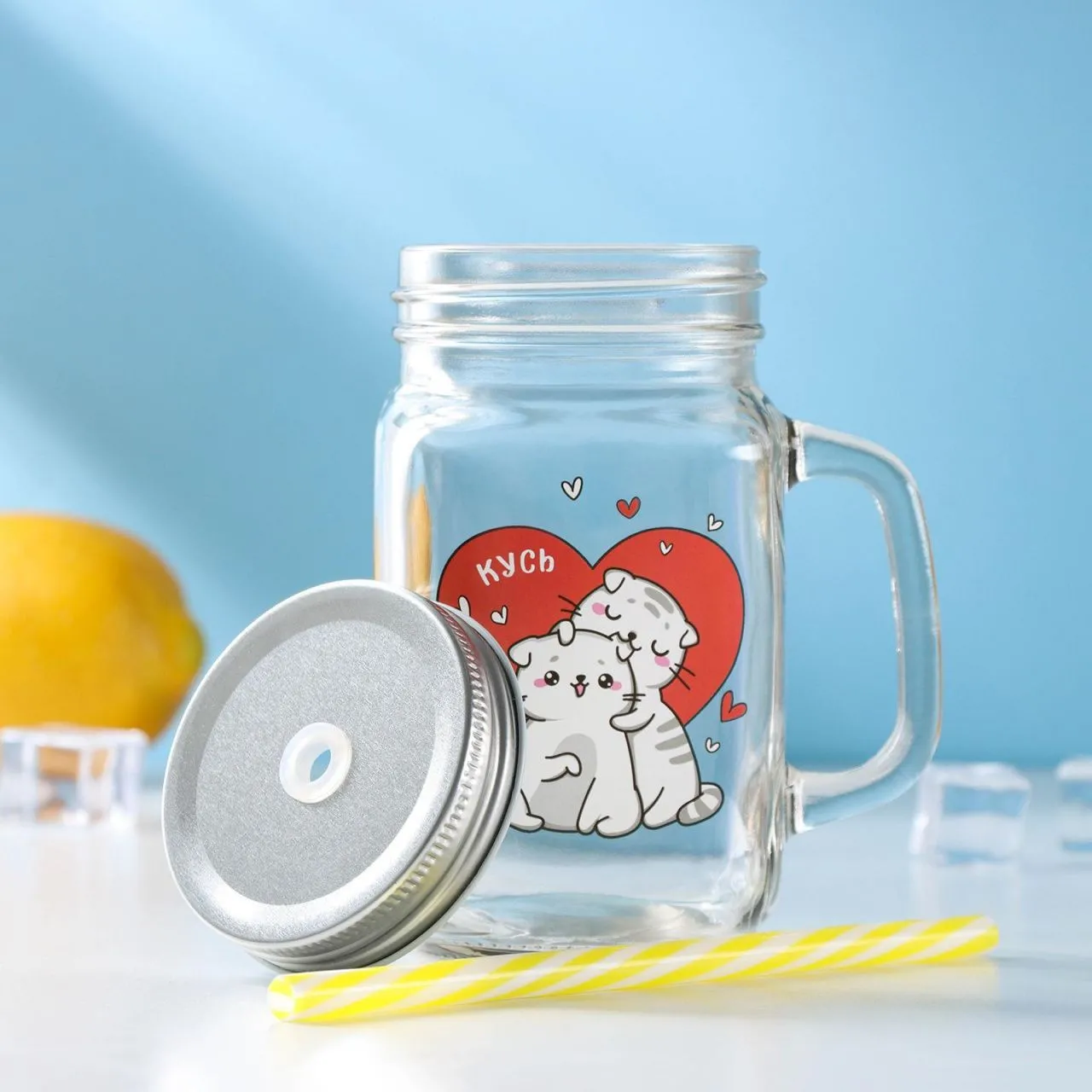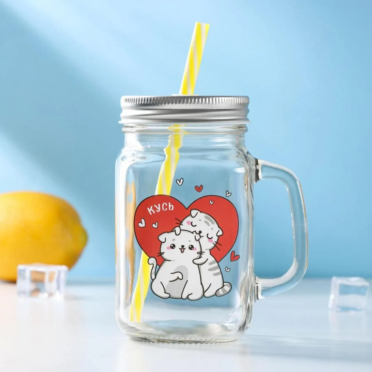 Банка с ручкой, крышкой и трубочкой "Котик" 450 мл, 10х7,5х13 см 5299820