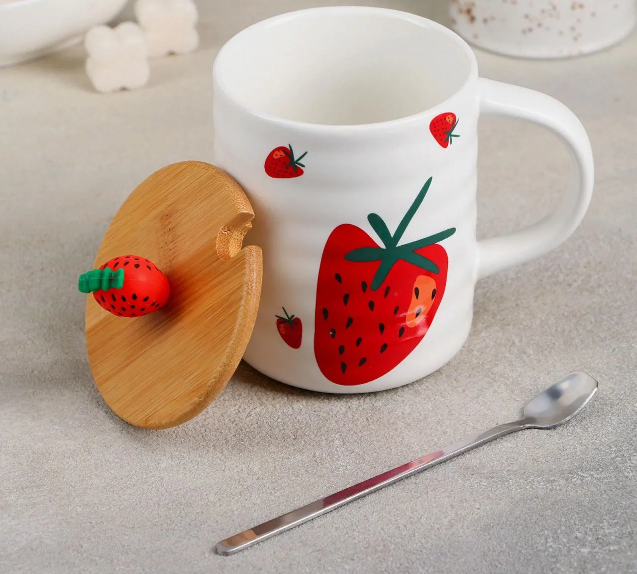 Кружка с деревянной крышкой и ложкой "Клубничка" 400 мл, 12х8,5х13 см, рис клубнички МИКС 4631532