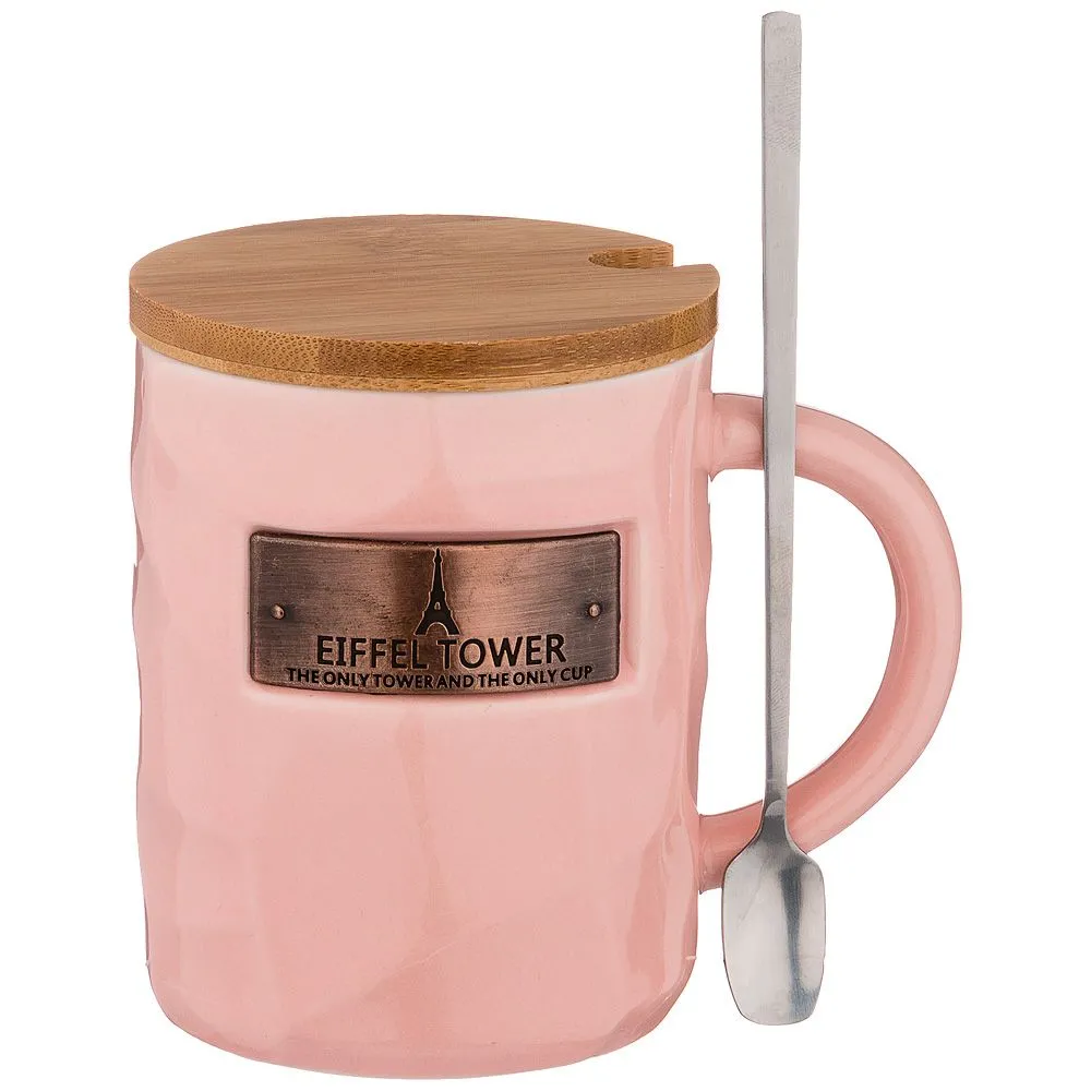 КРУЖКА "BREAK TIME" С ЛОЖКОЙ И ДЕРЕВЯННОЙ КРЫШКОЙ 375МЛ, РОЗОВАЯ (КОР=60ШТ.)