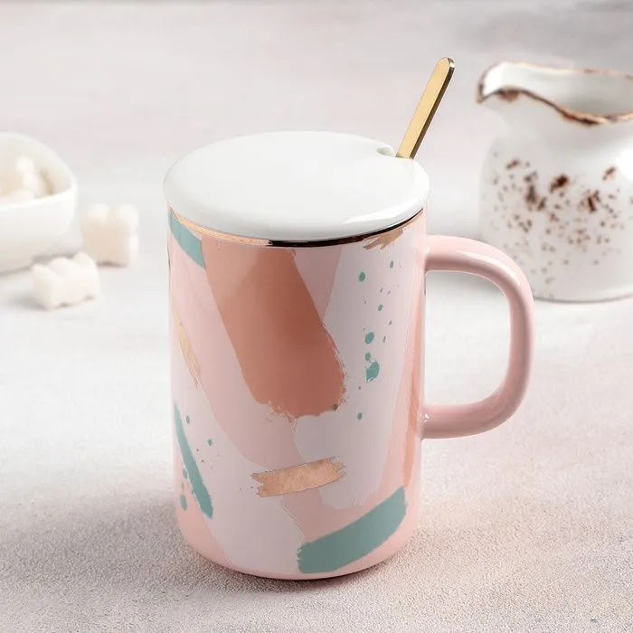 Кружка с керамической крышкой и ложкой "Анабель" 350 мл, 10,5x8x12 см, рисунок МИКС 4486643