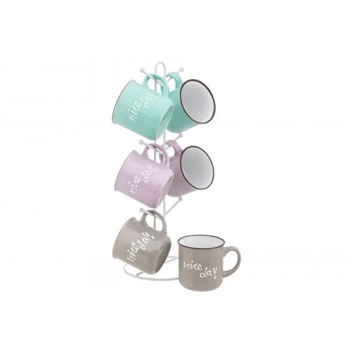 Набор 6 кружек "Nice day" бирюзовые + капучино + сиреневые, 12*8,5*8,5 см, 350 мл - каждая, с коричневым кантом, на металлической подставке, 15*15*41