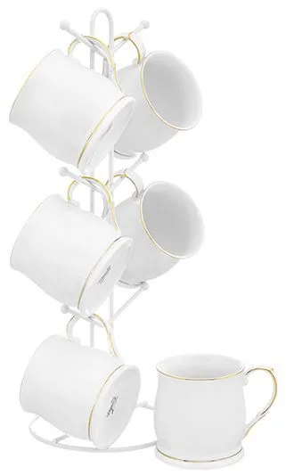 Набор 6 кружек "Белый с золотом", 11,5*8,5*8,5 см 350 мл, бочонок, на металлической подставке 15*15*41,5 см