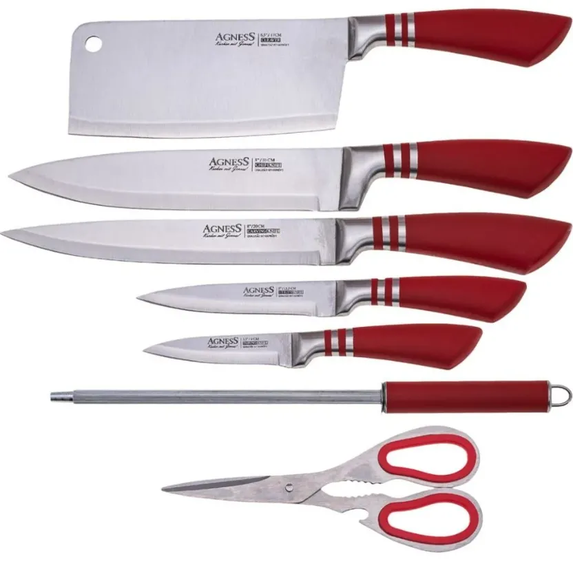НАБОР НОЖЕЙ AGNESS С НОЖНИЦАМИ И МУСАТОМ НА ПЛАСТИКОВОЙ ПОДСТАВКЕ, 8 ПРЕДМЕТОВ 911-643