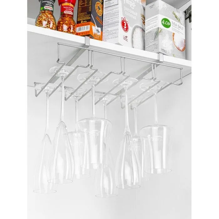 #Держатель для бокалов подвесной "Серебристый" 35,5*25,5*7,5 см, рассчитан на толщину поверхности не более 2 см, 4 секции для бокалов по 22 см