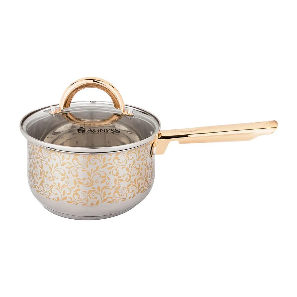 КОВШ AGNESS СО СТЕКЛ.КРЫШКОЙ, 1,2Л, 14Х7,5СМ,ВЫСОКОКАЧЕСТВЕННАЯ НЕРЖ.СТАЛЬ 18/10, ИНДУКЦИОН.ДНО