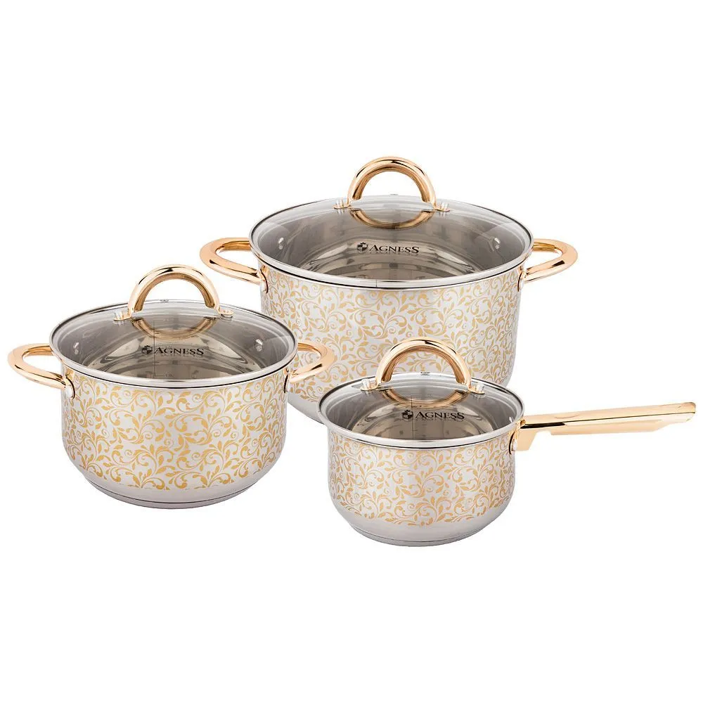 Набор посуды agness со стекл.крышками, 6пр. ковш 1,2л/ диа.14см, кастрюли 2,5л/18см, 3,5л/диа.20см, высококачественная нерж.сталь 18/10 937-747