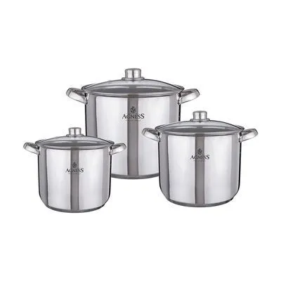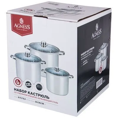 НАБОР КАСТРЮЛЬ AGNESS СО СТЕКЛЯННЫМИ КРЫШКАМИ НЕРЖАВЕЮЩАЯ СТАЛЬ (6 ПРЕДМЕТОВ) 9/11/13,5 Л