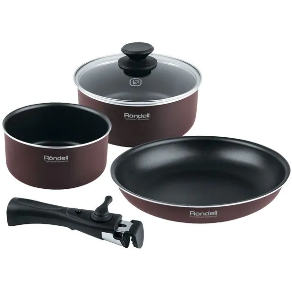 1012-RD Набор из 5 предметов (ковш 16см,/кастрюля с кр.20см,сковорода26х5см и съемная ручка) Kortado