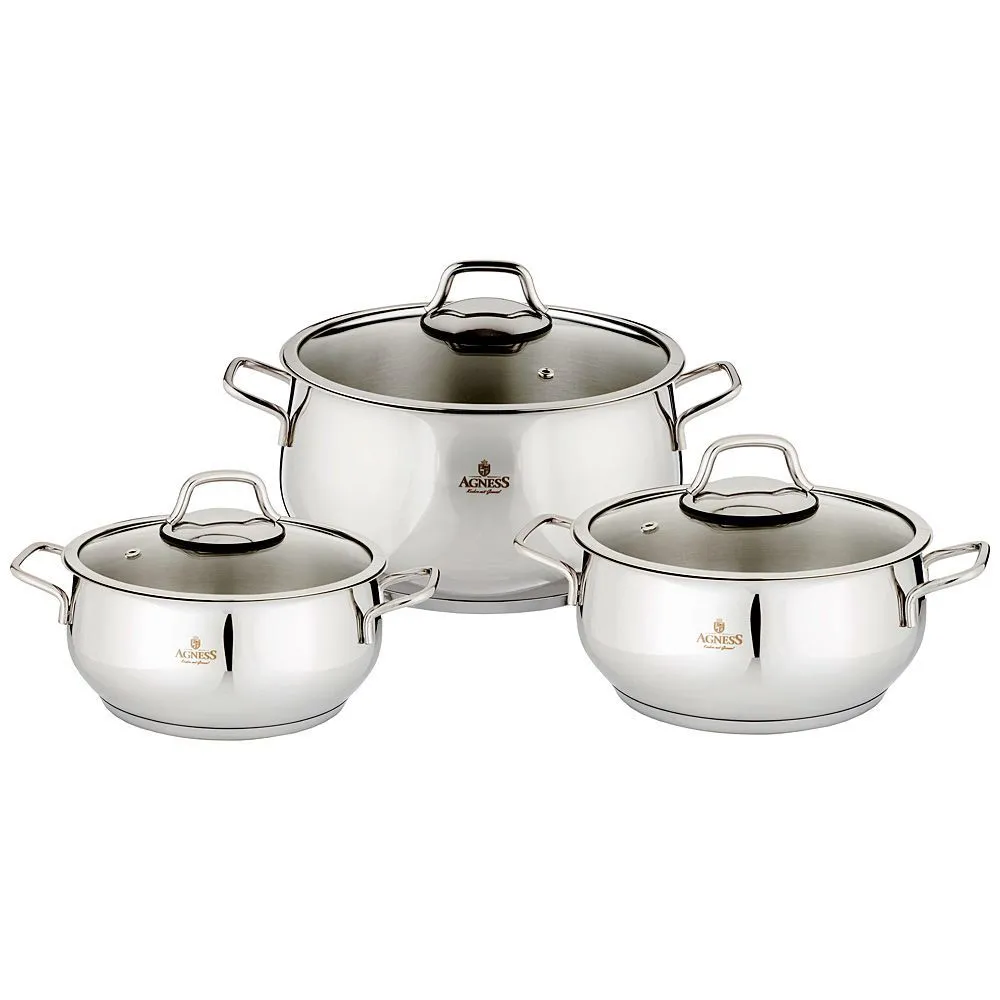 НАБОР КАСТРЮЛЬ 6 ПРЕДМЕТОВ AGNESS ГАРМОНИЯ 18X10/20X10/24X14 CM) 2,5/3,1/6,3 Л. НЕРЖ СТАЛЬ 18/10 ИНД ДНО