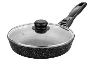 Сковорода глубокая 22 см ГАРМОНИЯ ВКУСА "Черный мрамор" 43*23*10,5 см, съемная ручка, с крышкой, ручка - 20 см, высота сковороды - 5,2 см, высота до р
